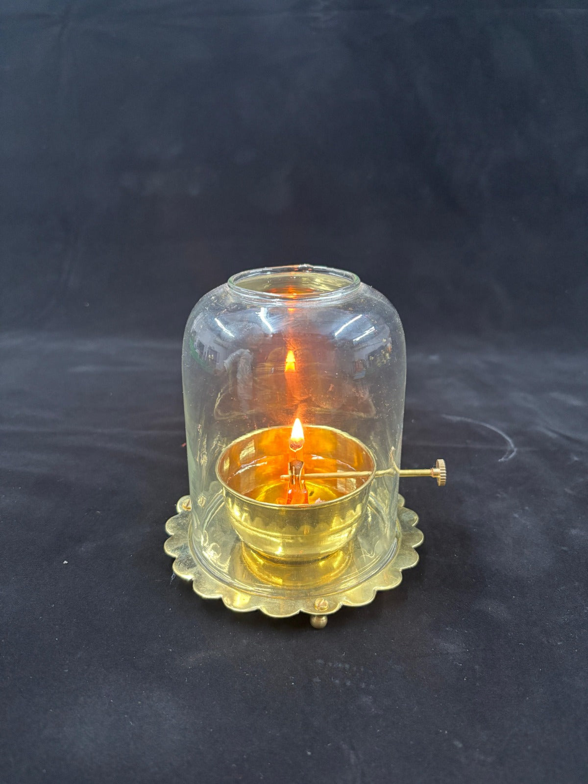 Pure Brass Akhand Jyot Diya with Adjustable Bati Knob, Wick Lifting Screw Lever, Glass Cover.